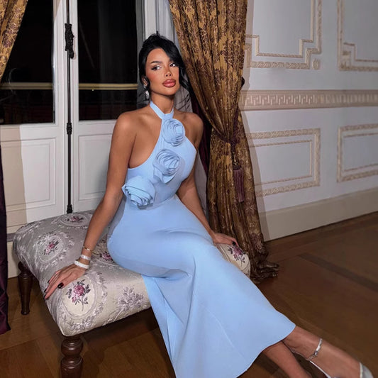 Women Clothing Three Dimensional Floral Sexy Halter Backless Split Dress