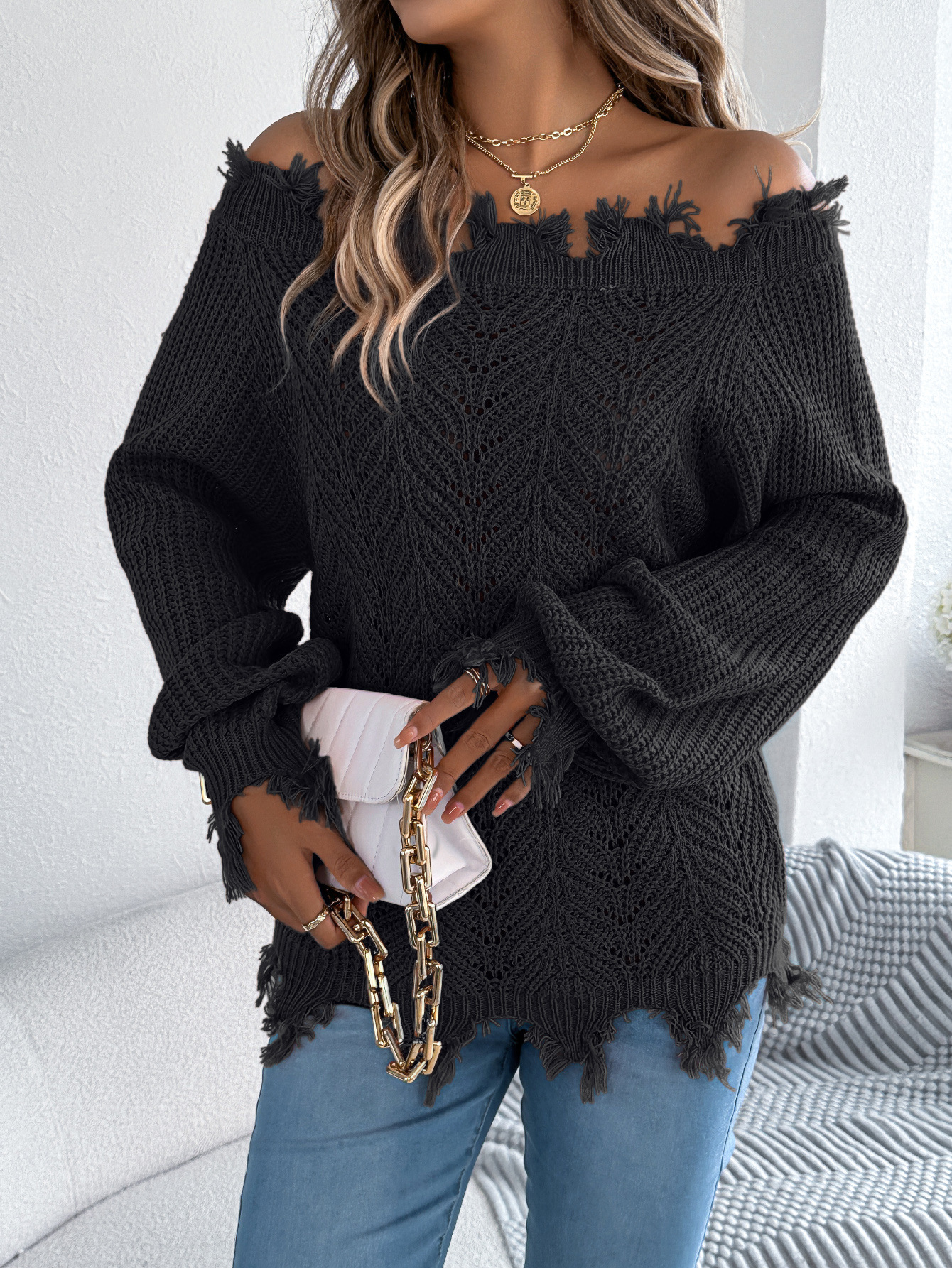 Autumn Winter Solid Color Hollow Out Cutout out Long Sleeve Cut off Shoulder Pullover Sweater Women Clothing