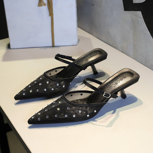 French Mesh Lace Pointed Toe Stiletto Toe Box Rhinestone Slippers Outer Wear Hollow Out Cutout Sexy Strap Half Slippers