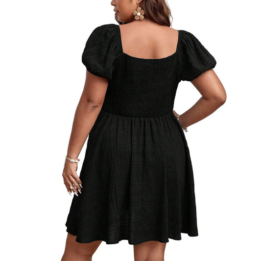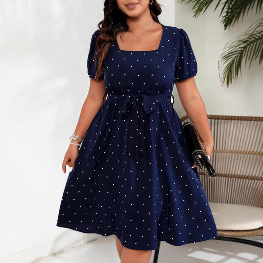 Plus Size Women Elegant Retro Dots Waist Controlled Lace up Square Collar Large Swing Dress