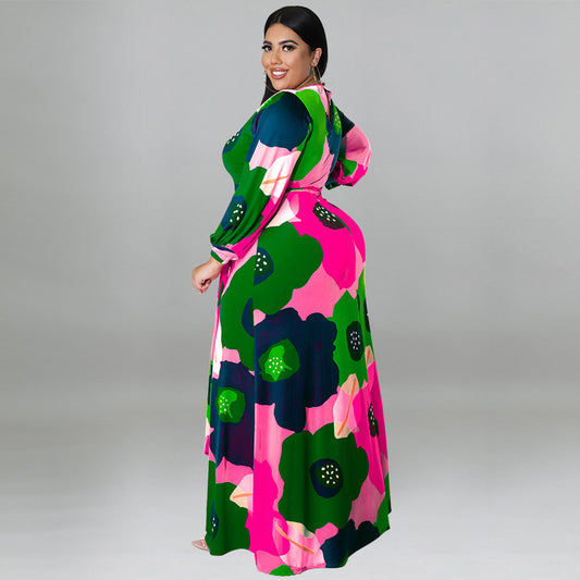 Plus Size Women Clothing Long Sleeve Dress Large Floral Printing Dress Long