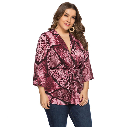 Plus Size Women Spring Autumn Loose Snake Pattern Lace Up Top