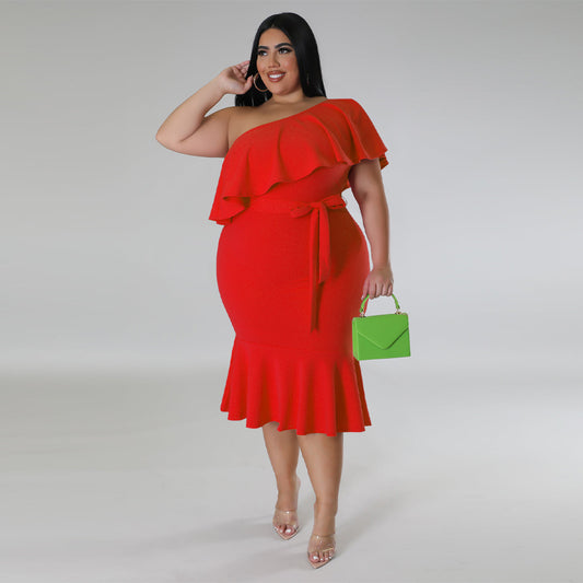 Plus Size Women Clothing Slim Casual Ruffled Tube Top Midi Dress
