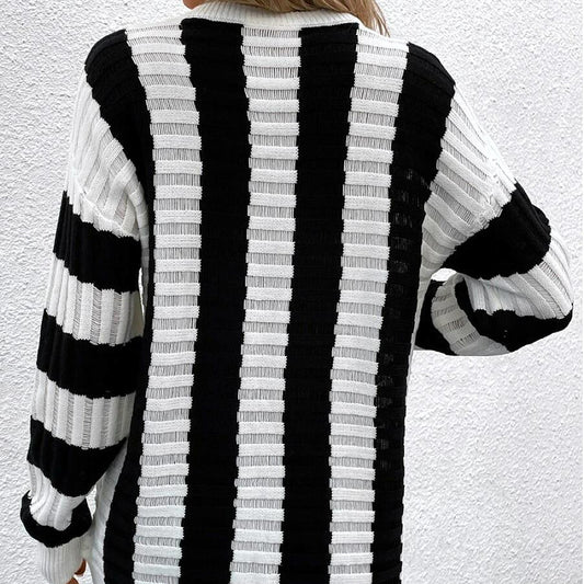 Spring Loose Sweater Women Striped Hollow Out Cutout out Long Sleeved Sweater