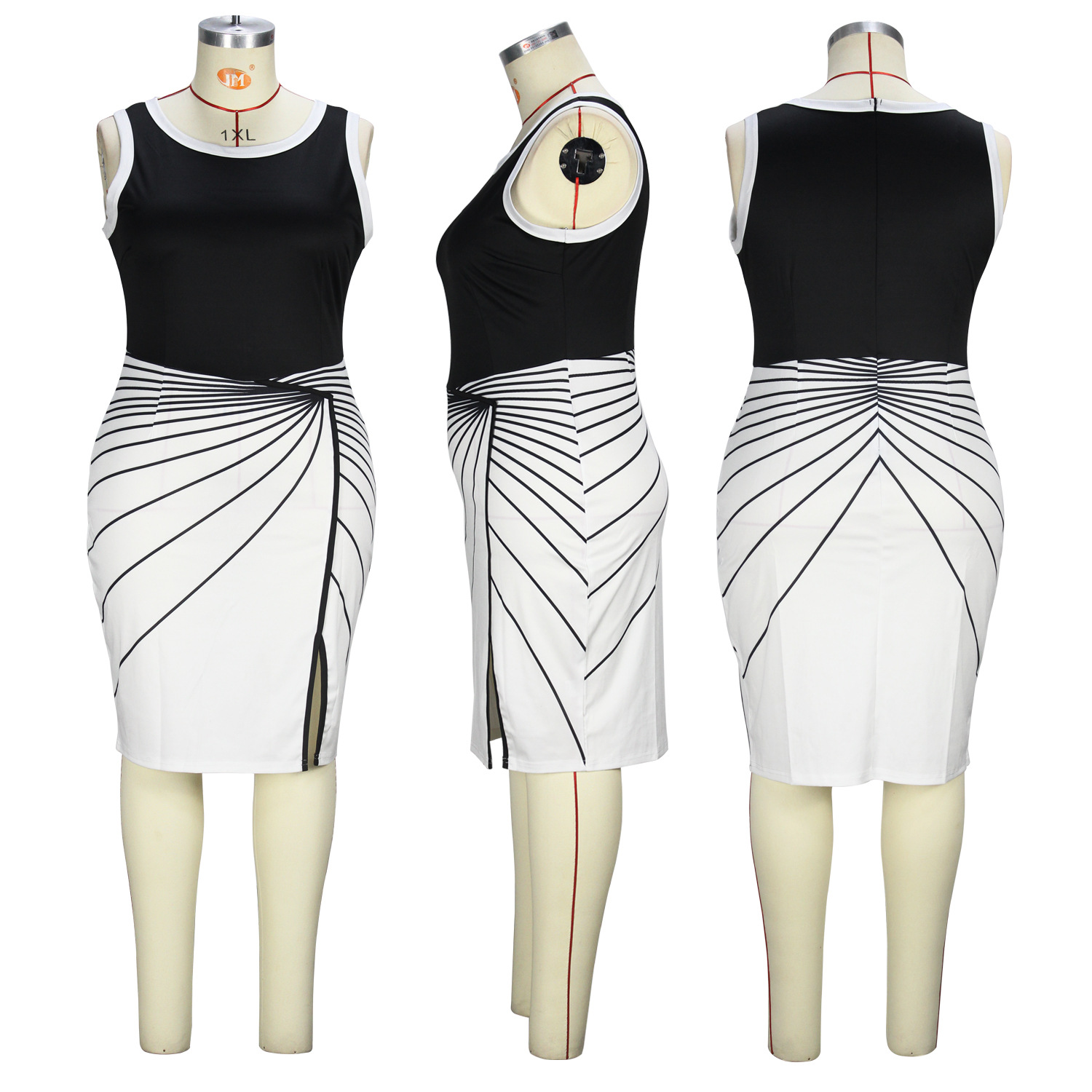Plus Size Spring Summer Elegant round Neck Sleeveless Line Printed Asymmetric Dress