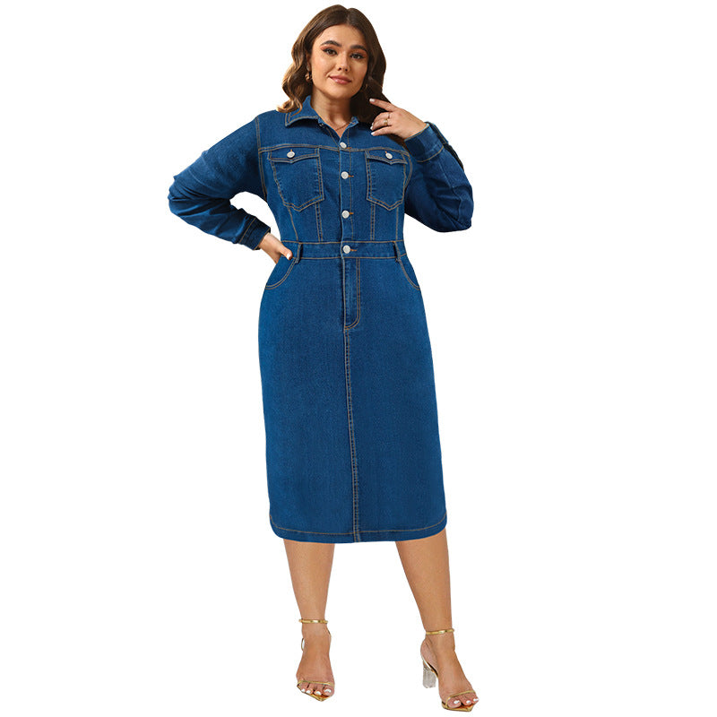Plus Size Women Clothing Denim Collared Long Sleeve Button Mid Length Dress